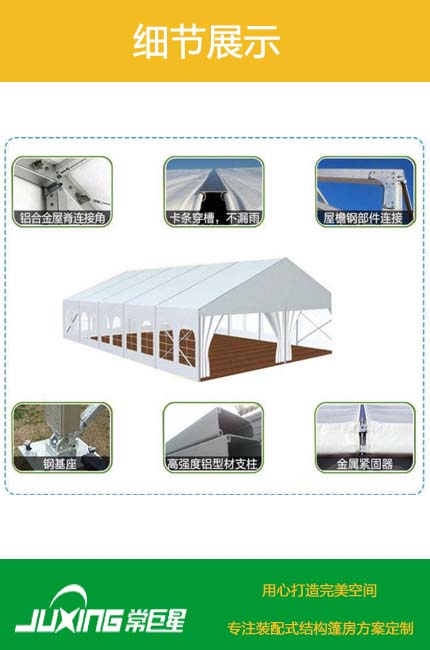 常巨星裝配式篷房提供種類豐富的活動篷房出售,租賃服務,可根據活動規模大小制造合適的篷房尺寸,為各種商業展示活動,產品發布會和促銷活動,廣告宣傳等營造出別具一格的時尚活動。公司現有篷房主體框架為中空鋁合金結構,連接部位為采用國家焊接鋼結構,可調節式基座可彌補場地的不平,篷房采用PVC篷布,該篷布具有不拉伸的良好性能,不透光,采用高頻焊接技術,篷房抗風能力達到80-100公里/小時。具有體積小,儲存方便,拆裝靈活快捷易運輸等特點,單位組合式結構,可根據場地的大小自由增加,對搭建場地無特殊要求,一般場地如草地、大理石地、瀝青地面、水泥地均可。篷房內無支柱,場地空間得到利用。